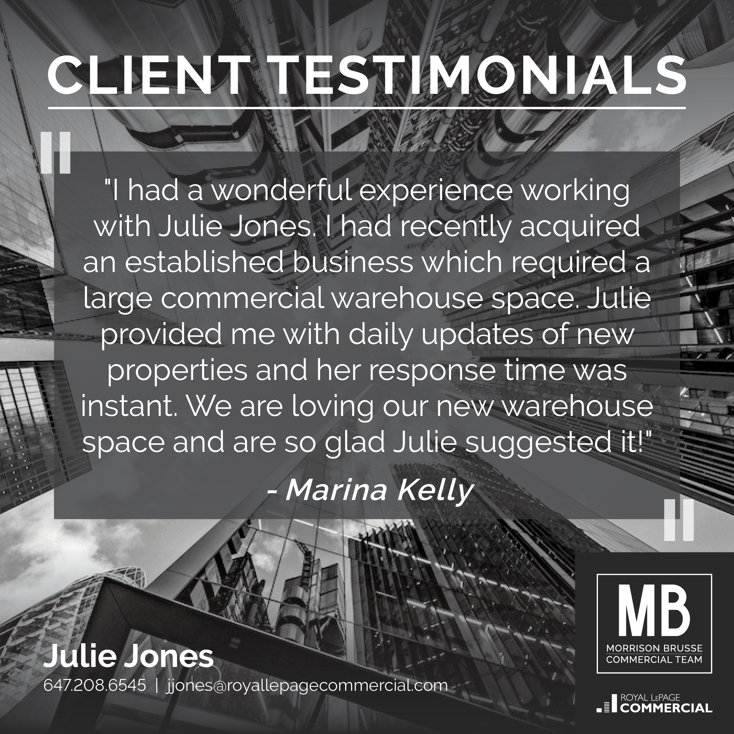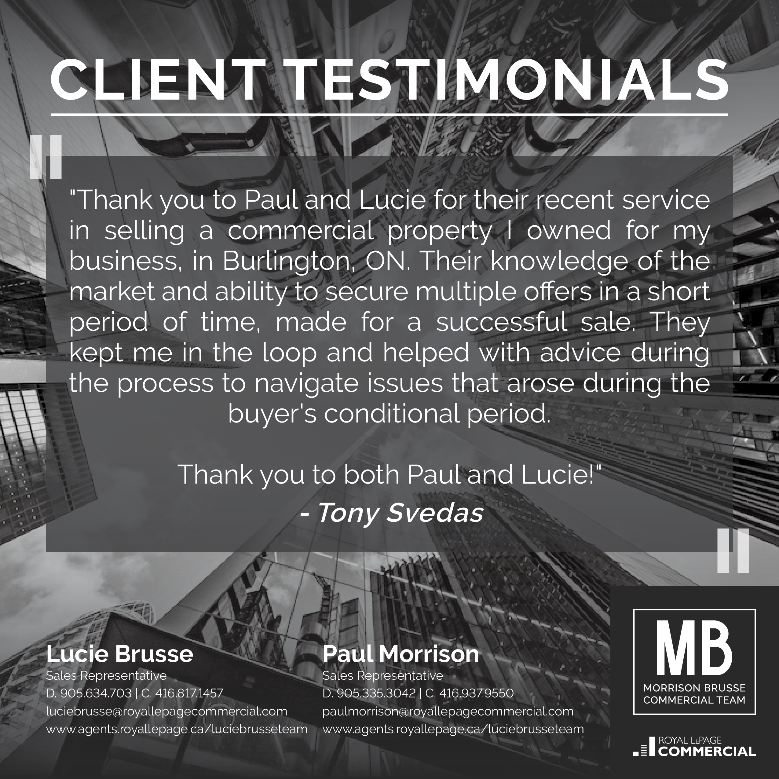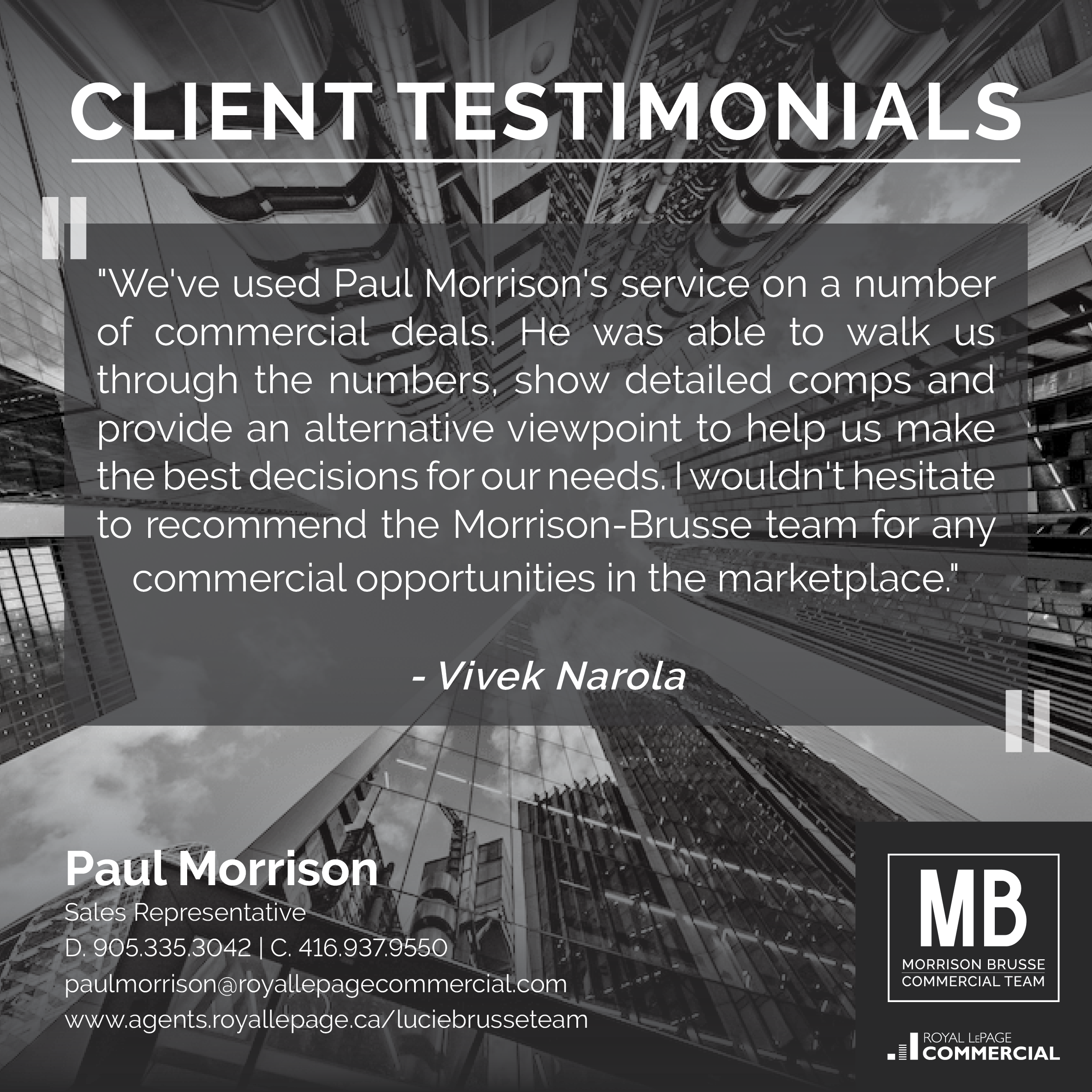 "In summary, our experience with Paul Morrison and Royal LePage Commercial was a very positive one and we look forward to working with Paul again as our business continues to grow and the probability of expansion increases.